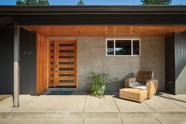 This Midcentury-style home features a Heritage Wood Exterior Door, with a Modern 7-Lite door style and Clear glass.
