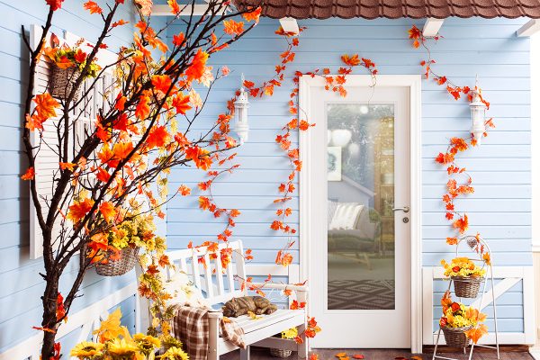 This Cottage-style home features a Timberline Smooth Fiberglass Exterior Door, with a Full Lite, Direct Glaze door style and Clear glass, prefinished in Classic White – 120.