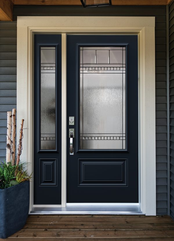 This Eclectic-style home features a Cambridge Smooth Steel Exterior Door, with a 3/4 Lite, 1-Panel door style and Brownstone glass, prefinished in Symphony – 176.
