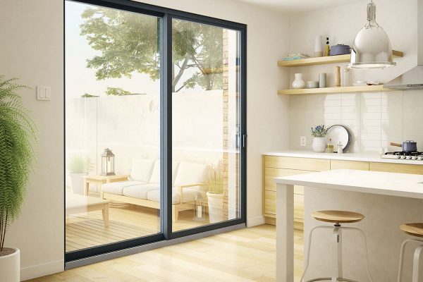 This Farmhouse-style home features a Urbania Sliding Patio Door, with Clear glass, prefinished in Black.
