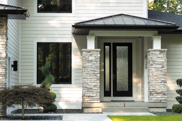 This Rustic-style home features a Cambridge Smooth Steel Exterior Door, with a Full Lite door style and Rain glass, prefinished in Symphony – 176.