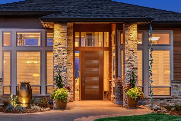 This Contemporary-style home features a Timberline Textured Fiberglass Exterior Door, with a 5-Panel Flat Shaker door style, and Addison Handleset hardware in Matte Black.