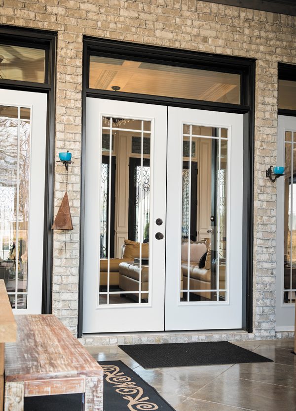 This Modern-style home features a Cambridge Smooth Steel Exterior Door, with a Full Lite door style and Internal Grille – Prairie glass, prefinished in Classic White – 120, with Georgian Knob hardware in Antique Brass.