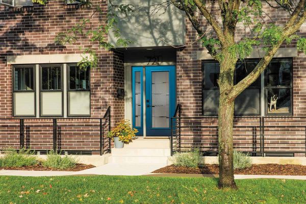 This Industrial-style home features a Cambridge Smooth Steel Exterior Door, with a Full Lite door style and Crosswalk glass, prefinished in Custom Color, with hardware in Matte Black.