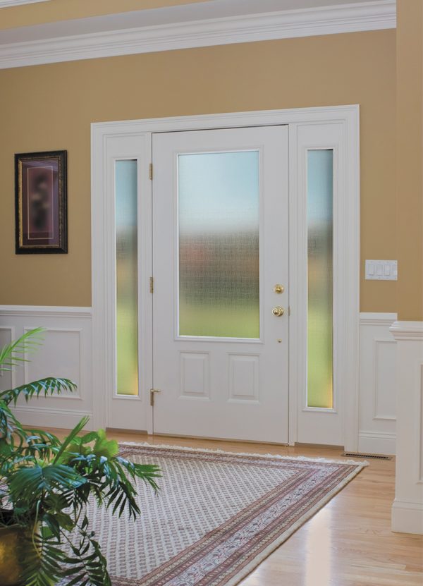 This Traditional-style home features a Cambridge Smooth Steel Exterior Door, with a 3/4 Lite, 2 Panels door style and Linen glass, prefinished in Classic White – 120, with Georgian Knob hardware in Bright Brass.