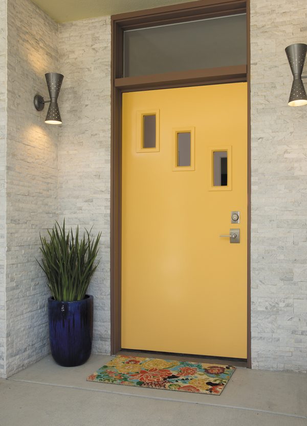 This Industrial-style home features a Cambridge Smooth Steel Exterior Door, with a Vertical Rectangle Lites, Small (Diagonal), Left door style and Clear glass, prefinished in Custom Color, with Latitude Lever with Century Trim hardware in Satin Nickel.