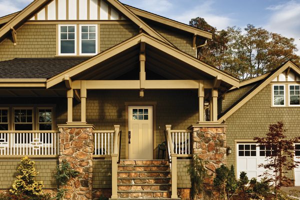 This Craftsman-style home features a Timberline Smooth Fiberglass Exterior Door, with a Craftsman Lite, 2-Panel Flat Shaker door style and Modern Simulated Divided Lite glass, prefinished in French Manor – 164.