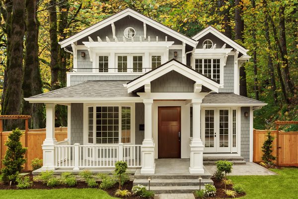 This European-style home features a Timberline Textured Fiberglass Exterior Door, with a 3-Panel Flat Shaker door style.